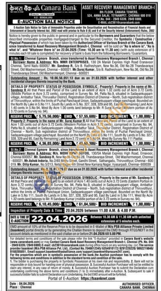 3. All that Piece and Parcel of the Land to an extent of Acre 1.40 cents out of Acre 3.72 Cents (Eastern Portion in Acre 3.72 cents), comprised in Survey No. 94, Patta No.9, situated in Sadayankuppam village, Ambattur Taluk, Thiruvallur District, Registration District of Chennai-North, Sub registration district of Thiruvottiyur, within the limits of Puzhal Panchayat Union, Sadayankuppam village panchayat. Bounded on the North By Lake in S.No 111, South By Lands in S.No. 327, 328, 329 and 95, East By Land in S.No 111, West By Acre 1.32 cents land belongs to Mr. R Sandeep Kumar (middle portion of Ac 3.72 cents in Survey no. 94).
