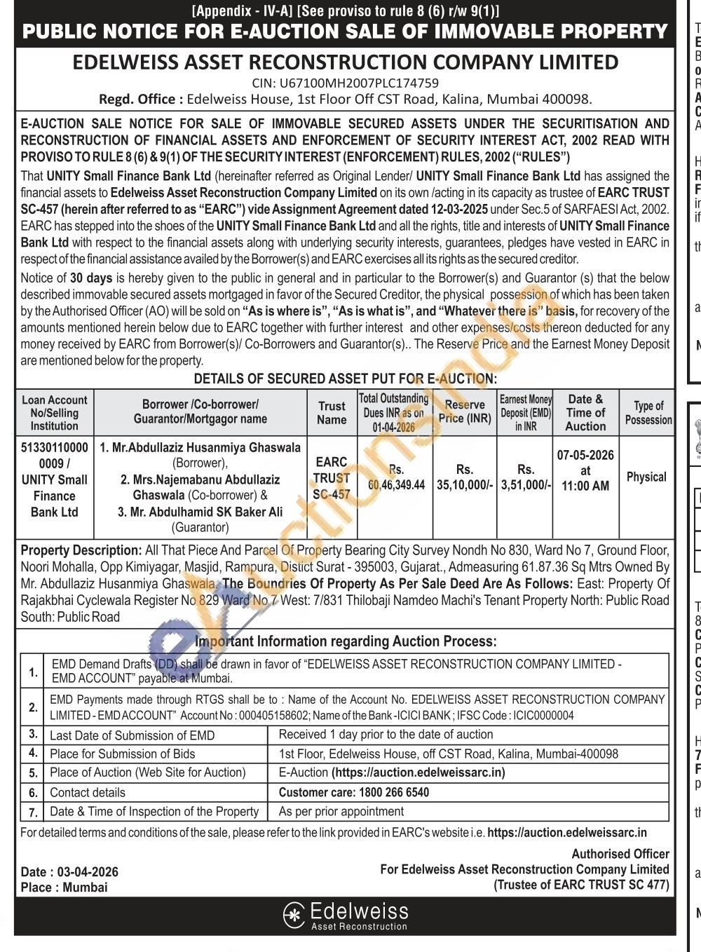 Property Description: All That Piece And Parcel Of Property Bearing City Survey Nondh No 830, Ward No 7, Ground Floor, Noori Mohalla, Opp Kimiyagar, Masjid, Rampura, Distict Surat-395003, Gujarat., Admeasuring 61.87.36 Sq Mtrs Owned By Mr. Abdullaziz Husanmiya Ghaswala. The Boundries Of Property As Per Sale Deed Are As Follows: East: Property Of Rajakbhai Cyclewala Register No 829 Ward No 7 West: 7/831 Thilobaji Namdeo Machi's Tenant Property North: Public Road South: Public Road