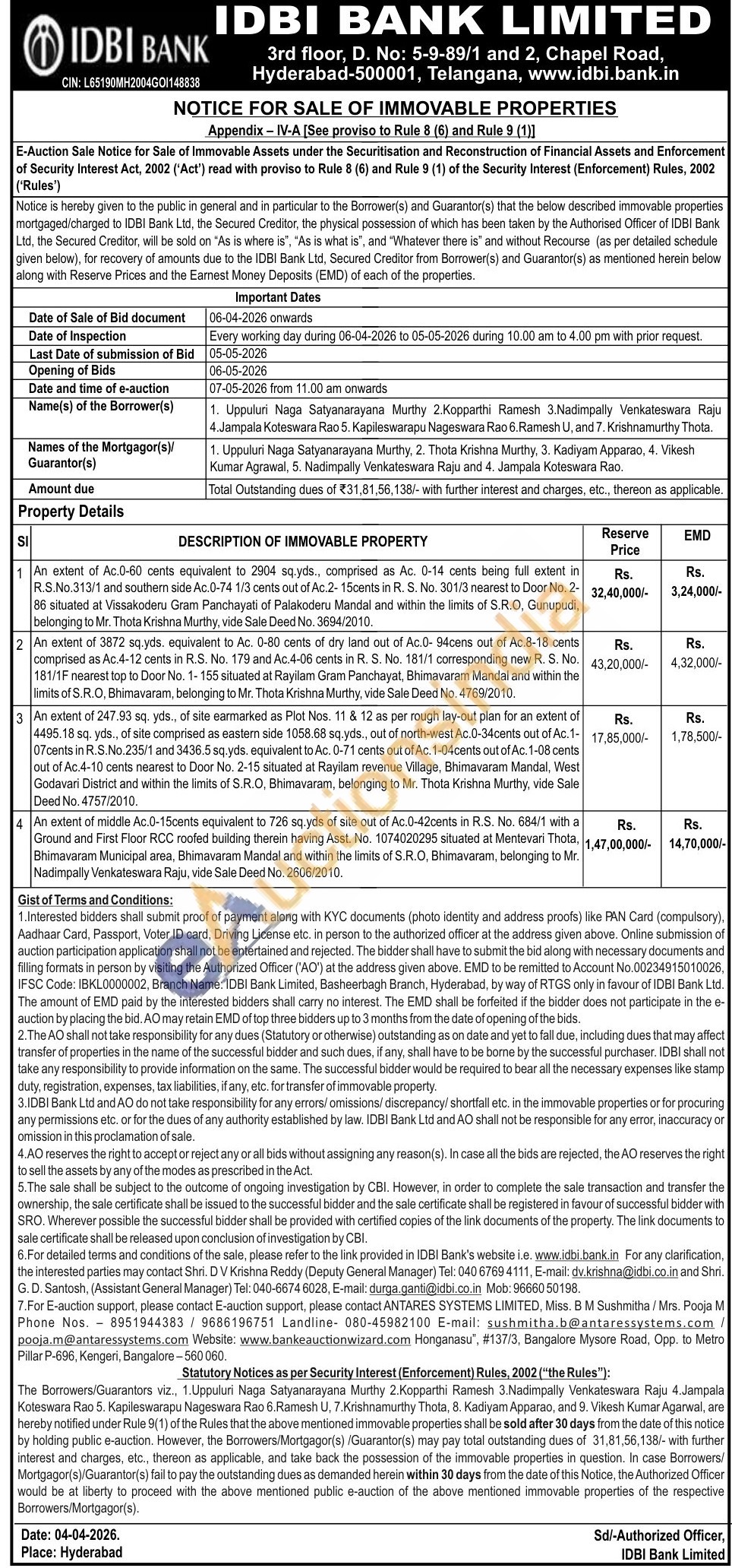 Shri. DV Krishna Reddy (Deputy General Manager) Telephone No : 04067694111 / Shri. G. D. Santosh (Assistant General Manager) Telephone No : 04066746028 / Mobile No : 9666050198