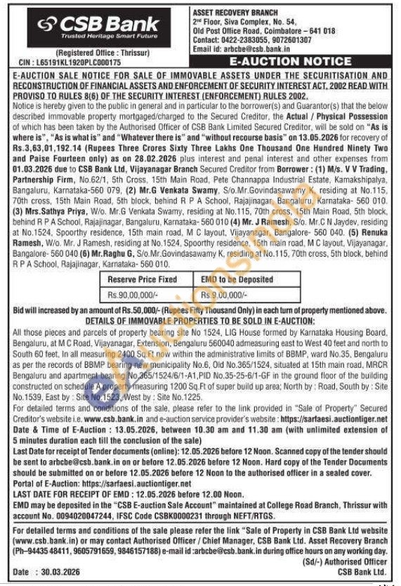 All those pieces and parcels of property bearing site No 1524, LIG House formed by Karnataka Housing Board, Bengaluru, at M C Road, Vijayanagar, Extension, Bengaluru 560040 admeasuring east to West 40 feet and north to South 60 feet, in all measuring 2400 Sq.Ft now within the administrative limits of BBMP, ward No.35, Bengaluru as per the records of BBMP bearing new municipality No.6, Old No.365/1524, situated at 15th main road, MRCR Bengaluru and apartment bearing No.365/1524/6/1-A1, PID No.35-25-6/1-GF in the ground floor of the building constructed on schedule A property measuring 1200 Sq. Ft of super build up area: North by: Road, South by: Site No. 1539, East by: Site No. 1523, West by: Site No.1225.