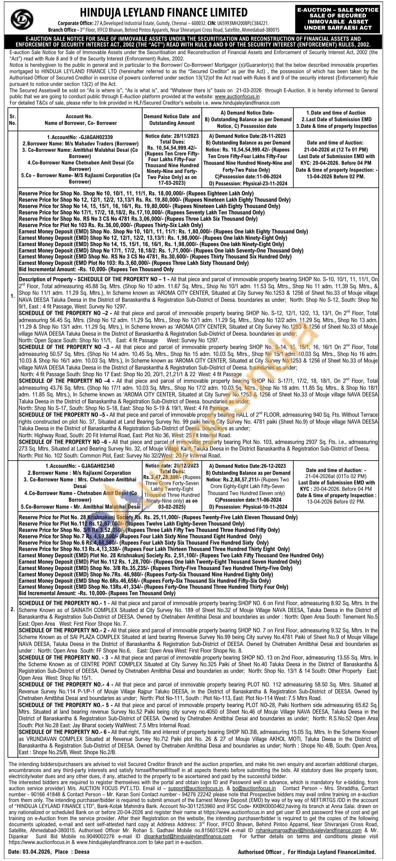 All that piece and parcel of immovable property bearing SHOP NO. 6 on First Floor, admeasuring 8.92 Sq. Mtrs. In the Scheme Known as of SAINATH COMPLEX Situated at City Survey No. 189 of Sheet No.32 of Mouje Village NAVA DEESA, Taluka Deesa in the District of Banaskantha & Registration Sub-District of DEESA. Owned by Chetnaben Amitbhai Desai and boundaries as under: North: Open Area South: Tenement No.5 East: Open Area West: First Floor Shope No. 7.