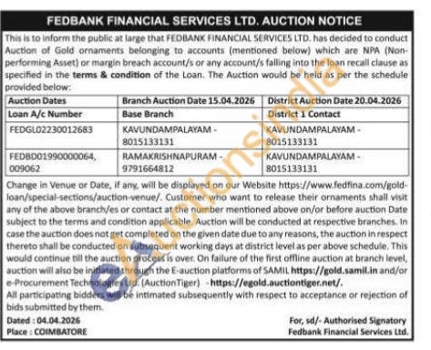 Fedbank Financial Services Ltd Gold Auctions Auction in Coimbatore