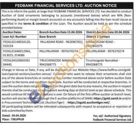 Fedbank Financial Services Ltd Gold Auctions Auction in Tiruppur