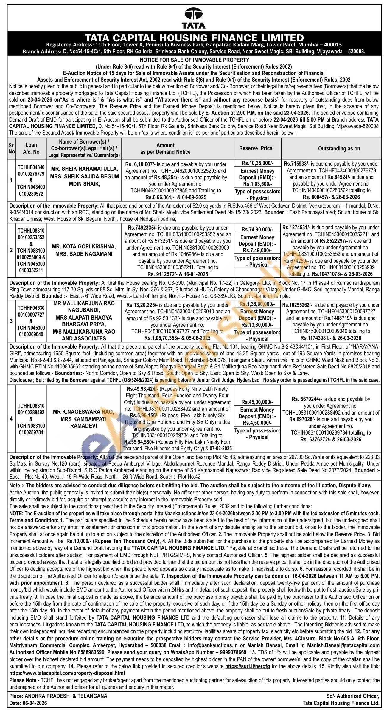 bounded as follows:- Boundaries:- North: Corridor, Open to Sky & Road, South: Open to Sky, East: Open to Sky, West: Open to Sky & Lane. Disclosure; Suit filed by the Borrower against TCHFL (OS/5246/2024) is pending before V Junior Civil Judge, Hyderabad, No stay order is passed against TCHFL in the said case